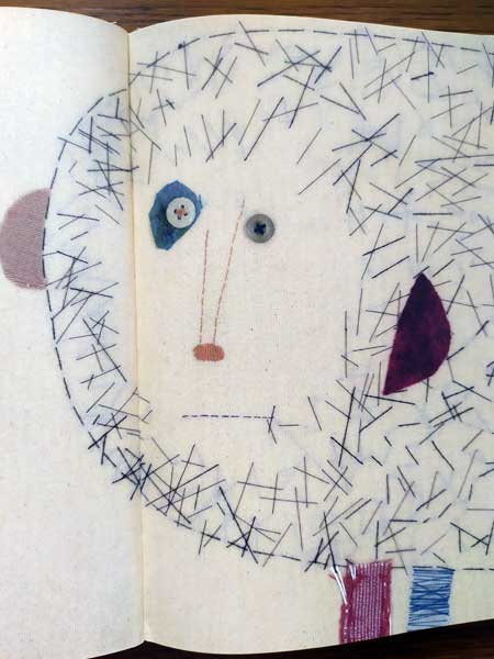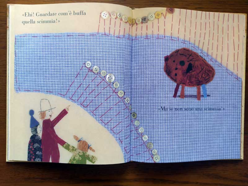 Oppure potrei partire dalla tecnica, visto che in questa storia cucita a mano trovo molto gusto e finezza; le immagini, a pagina doppia, sono costruite con stoffe, tantissimi bottoni di diversi colori, ricami e merletti.