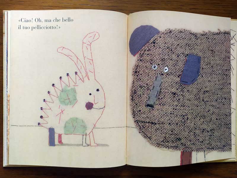 Il nostro, in effetti, è ogni volta un po’ diverso: le zampe cambiano colore man mano che si voltano le pagine, come se indossasse stivali differenti; il pelo anche, a volte chiaro, altre sul marrone o sul grigio; e poi le orecchie, deliziose e più o meno pelose, sembra che in certi casi indossi eleganti paraorecchie.
