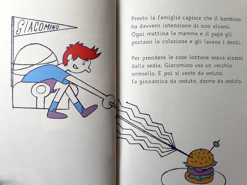 Giacomino già che sei in piedi è la storia di un comune ragazzino che un giorno, stanco di gironzolare per casa, senza mai un attimo di riposo, per cercare di soddisfare tutte le richieste avanzate dai suoi familiari che si approfittano della sua disponibilità, decide di sedersi e di non rialzarsi più.