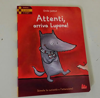 - Il primo è “Attenti, arriva Lupone!“, del raffinato autore belga Émile Jadoul, molto vicino per sensibilità e delicatezza all’universo dei più piccoli. Si tratta di uno spiritoso cartonato con alette che descrive un gioco del nascondino col brivido. Lupone conta fino a 10 e si mette alla ricerca degli animaletti nascosti: coniglietti, porcellini, galline e pecorelle spaventate… Che fine faranno le bestioline dopo essere state catturate dal Lupone e riposte nel suo cestino? Lui dice di essere veramente affamato! Per bambini dai 2 anni.