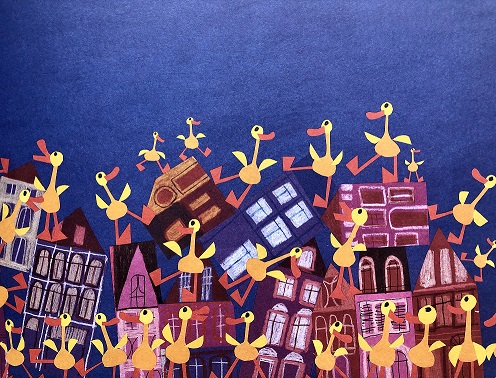Ma di oche ne arrivano altre, direttamente dal cielo, pure col paracadute. Alla bellezza di quel che si osserva cadere dal cielo, proprio come fa d’inverno la neve, nessuno resiste. Il mostro è stupefatto e finisce per arrendersi di fronte a così tanta meraviglia.