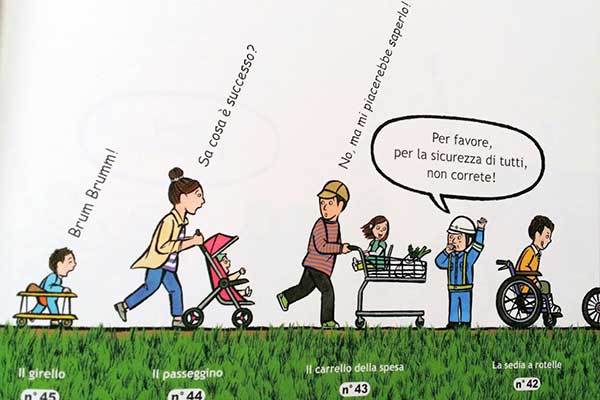 Giriamo pagina ed ecco comparire una raffica di persone bloccate in una lunghissima fila. Il bimbo col triciclo si ritrova alla fine della coda, e si incolonna. Davanti a lui, altrettanto stupiti per quel blocco stradale, tanti altri ragazzini e adulti, ognuno su un mezzo di trasporto diverso. C’è chi viaggia sui pattini, chi sul monopattino, chi in bicicletta, chi sul carrello della spesa e chi si muove sulla sedia a rotelle.