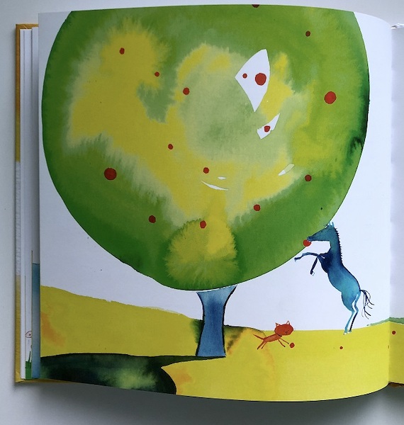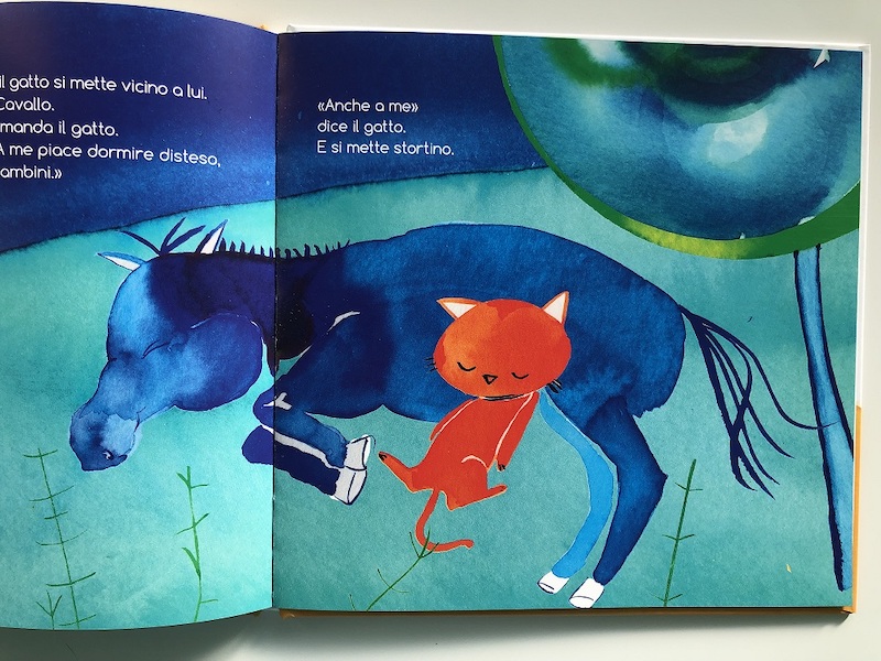 Delle immagini, colorate e brillanti, si è invece occupata Elisabetta Civardi, che sembra aver delineato Piccolo Cavallo, Gatto Arancione e il paesaggio naturale circostante con l’ausilio di acqua e pennelli.