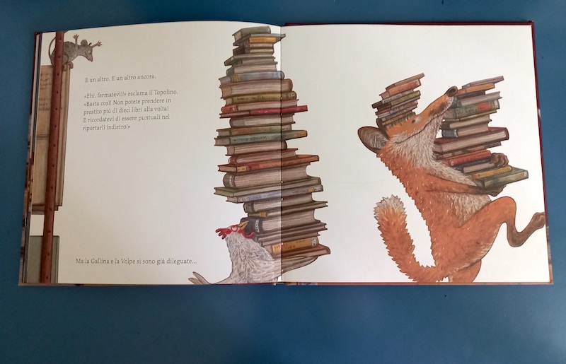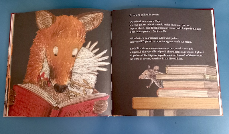 E non è solo il topo a trarne beneficio. Qualche notte dopo tocca anche a un’altra ambita preda della volpe, una povera gallina, che arriva in biblioteca già in bocca al suo predatore, che curiosamente si giustifica «L’avevo già tra i denti, quando mi ha chiesto se, per caso, sapessi che gli ossi di pollo possono essere pericolosi per la mia gola e per la mia pancia… Sarà vero?!».