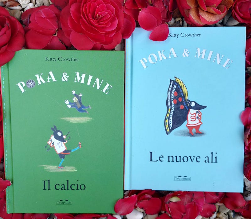 Creati dall’autrice e illustratrice belga Kitty Crowther, Poka & Mine sono i protagonisti di una delicata serie nata Oltralpe nel 2005, che negli anni ha collezionato diversi episodi. Arriva per la prima volta in Italia nel 2021 per merito dell’editore milanese Topipittori, che affida la traduzione alla poetessa Chandra Livia Candiani. I titoli di questo lieto debutto sono: “Le nuove ali” e “Il calcio“.
