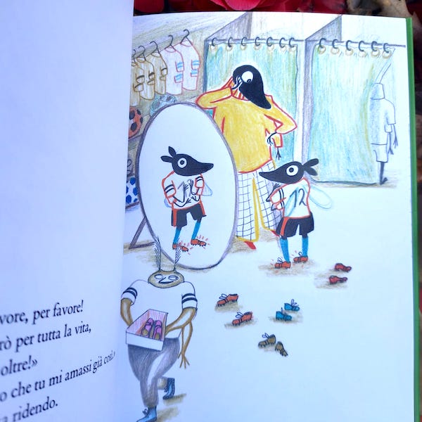 Si iscrive allora a un corso di calcio, riceve una bella divisa di squadra e, con il papà, va a comprare le scarpe coi tacchetti. Quelle rosse a marchio Gibs che brillano dalla vetrina le sembrano le più desiderabili e supplica il padre di comprarle, anche se sono care. È convinta che con quelle ai piedi giocherà meglio.