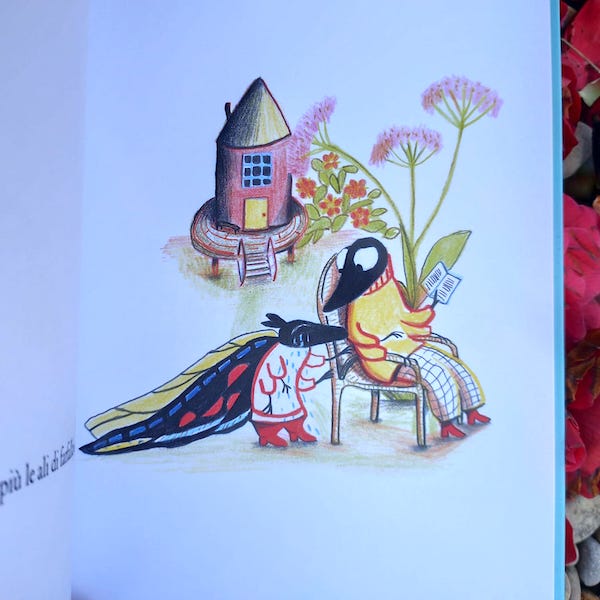 Lei ne va fiera, sono davvero due ali gloriose, ma già quando stanno per rientrare a casa si rende conto che non sono molto adatte… sono talmente ingombranti e pesanti che non riesce a volare e le deve piegare tutte per passare attraverso la porta.