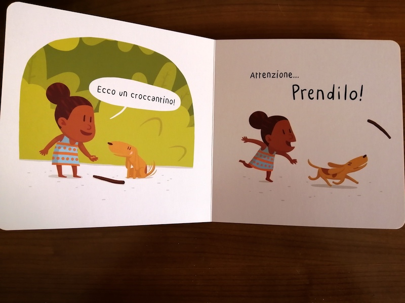 L’azione prosegue ricalcando la stessa dinamica: la bambina lancia il ramoscello, il cane si allontana correndo, il lettore lo perde di vista per un momento, ma poi ecco riapparire l’animale soddisfatto con la sua “preda” tra i denti e una ricompensa di croccantini ad aspettarlo.