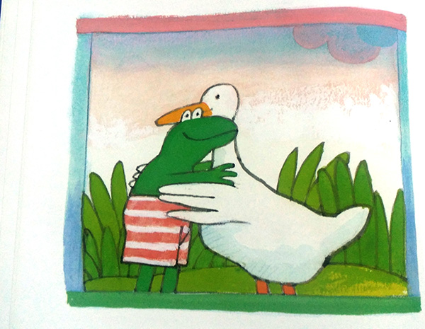 A casa mia Ranocchio è adorato. In primo luogo da me, completamente catturata dal suo candore e dal suo incedere nel mondo a passi lenti e fiduciosi, in secondo luogo da mio marito e da mia figlia, affascinati dalla scrittura cadenzata e rassicurante di Velthuijs (in Italia la traduzione è curata dal bravissimo Alfredo Stoppa) e dallo stile pieno e romantico delle sue illustrazioni.