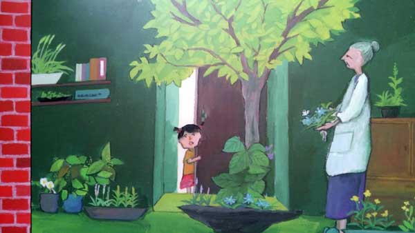 È talmente concentrata sulla sua missione, che quasi non fa caso ai buffi personaggi che incontra e alle loro stranissime dimore. Ambienti casalinghi di tipo tradizionale si alternano a stanze fantastiche, illustrate con pennellate piene, corpose, rigogliose, dove mobili e suppellettili fluttuano nell’aria, dove il mondo esterno invade quello domestico, dove animali, piante, pesci diventano gli stravaganti inquilini di spazi immaginari e suggestivi.
