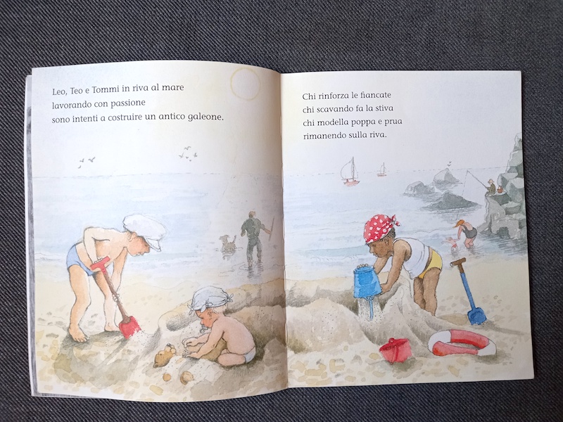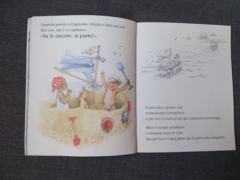 Una piccola nota per chi come noi ama i giochi in spiaggia. Dopo aver letto questo libro siamo andati davvero sulla sabbia armati di bastone e bavaglino per costruire il nostro galeone. Perché i libri hanno realmente il potere di far viaggiare l’immaginazione.