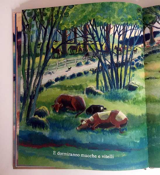 Già al primo ascolto (la canzone è inclusa nel libro, scaricabile tramite QR code) si coglie la qualità di questo adattamento poetico. La canzone è piacevolissima, le parole scivolano nelle orecchie e rotolano sulla lingua quando siamo noi a cantarle; penso ad esempio al suono vibrante della /r/ che, gustoso, ritorna e ci riempie la bocca. Dolce, coerente e comoda nel vincolo metrico, Tutto dormirà ha le carte giuste per poter entrare nel repertorio di molte delle nostre famiglie. Nella mia è già entrata, prestandosi a qualche piccola personalizzazione: al posto del gatto, suonano benissimo i nomi ora dell’una, ora dell’altra bimba di casa, che ogni sera ci ingegniamo per accompagnare al sonno.