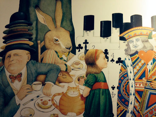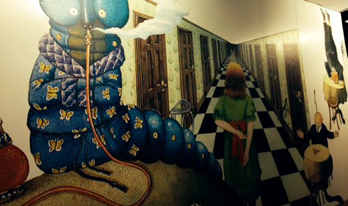 La lettura del calendario degli eventi della giornata passa in secondo piano quando ci troviamo di fronte alla maestosità del tunnel di Alice. Si tratta di un corridoio di pannelli di cartone giganti dentro cui sono illustrate scene della fiaba di Alice nel paese delle meraviglie di L. Carroll.