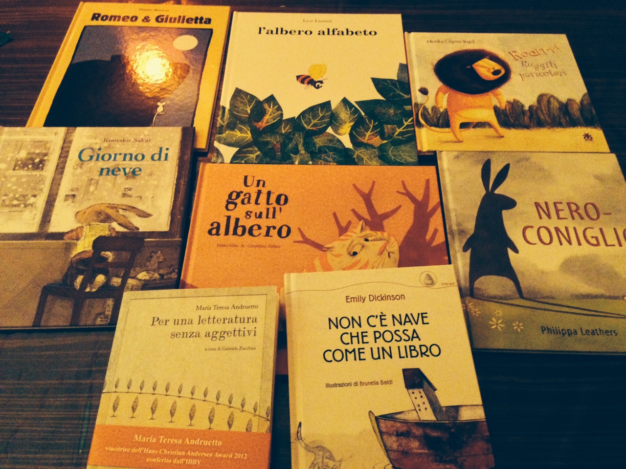 Poi, è iniziato lo shopping, tra la ricerca di qualche testo suggerito da altri e la scelta di nuovi albi sulla base di criteri rigorosamente “scientifici”: copertine colorate e molto divertenti oppure molto delicate; la sensazione tattile provata nello sfogliare la carta; il formato che più si addicesse ai nostri spazi di lettura a casa. Alla fine abbiamo raccolto un bel bottino!