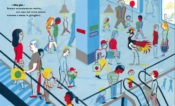 Pagine movimentate, dal segno grafico forte e pieno che raffigurano situazioni surreali. Ma se da un lato ci stupisce vedere un uccellino fra i banchi di scuola, un leone al mare sotto l’ombrellone, o un pavone che va a prendere la scala mobile, dall’altro, leggendo il testo e le descrizioni fornite dalla voce narrante, ci sembra tutto molto naturale e appropriato.