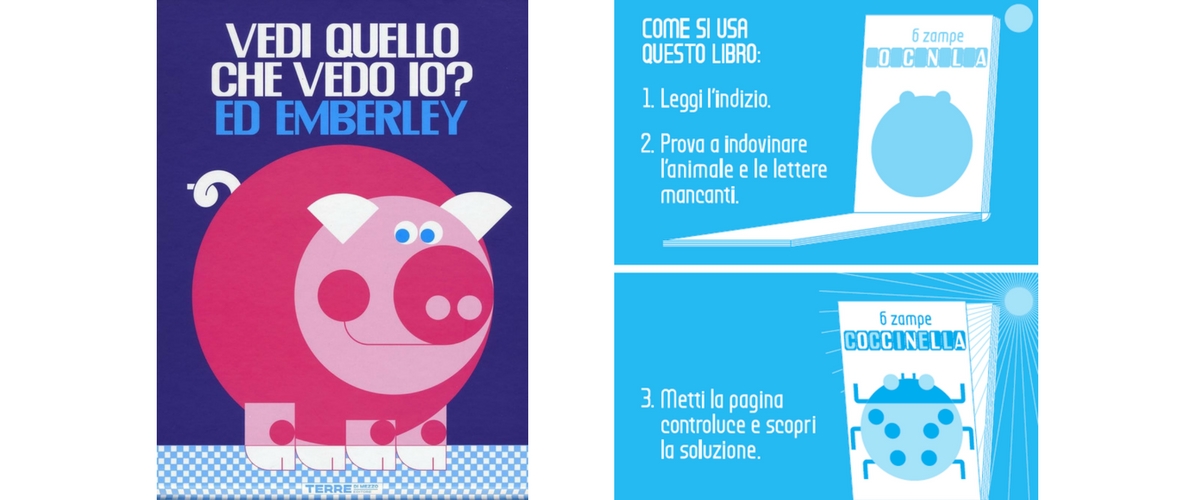 12 indizi per scoprire 12 animali, un paio di lettere d’aiuto ma se proprio la soluzione non viene in mente, basta mettere in controluce la pagina… e la parola appare interamente!