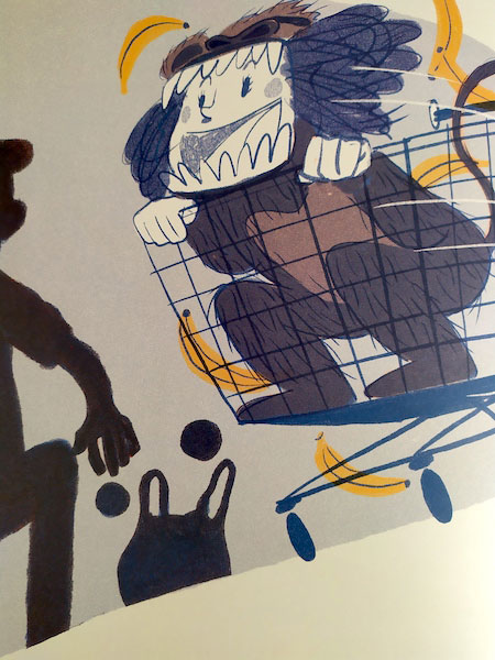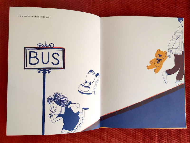 Però è una storia per tutti e le illustrazioni sono godibili e divertenti; i colori non sono eccessivi, fanno anzi da contenimento alla vivacità del tutto, restano sobri e chiusi in una tavolozza di bianco, arancione carota e gradazioni di blu: lo si evince già dalla copertina, con una gigante bambina-King Kong, e dai risguardi, che sanno di cose comuni di casa come le piastrelle di un bagno.
