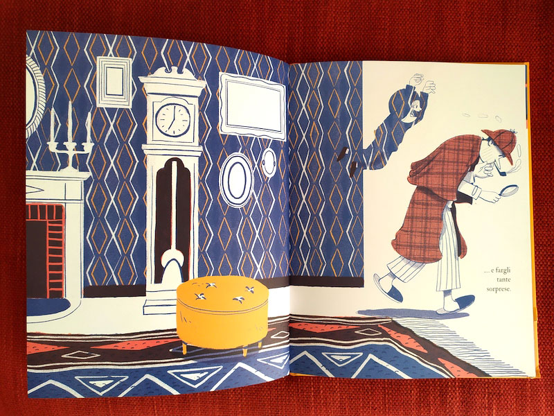 Da sottolineare mostruosamente, perché è avverbio, riferito a noioso, ma anche soluzione del problema: c’è una bambina che cammina per mano al suo papà e al suo orso di pezza, e alla pagina seguente c’è una bambina che corre via sorridendo alla libertà e alla fantasia, ciao allo zaino ciao al papà ciao all’orso di pezza… questa bambina vorrebbe essere King Kong! ma non solo, a seconda delle circostanze vorrebbe essere anche l’Uomo Invisibile, per guardare i cartoni indisturbata (in una tavola divertente la bambina si mimetizza con la tappezzeria del salotto e poi sorprende spaventandolo il papà alle sue spalle! il quale da buon co-protagonista è impegnato nella parte dell’investigatore), la Mummia, per nascondere tesori e non lavarsi, la fortissima creatura di Frankenstein, l‘Uomo Lupo e Dracula (che spaventosa ombra proietta, che denti aguzzi! ma siamo sicuri che il conte non ha bisogno di lavarseli i denti?).